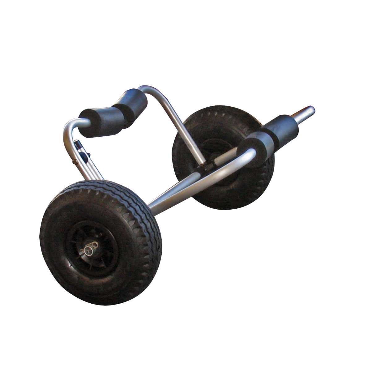 Economical lightweight folding kayak trolley, pneumatic tyres, alloy frame and adjustable supports. Folding arm to allow kayak placement and fastening with webbing strap.